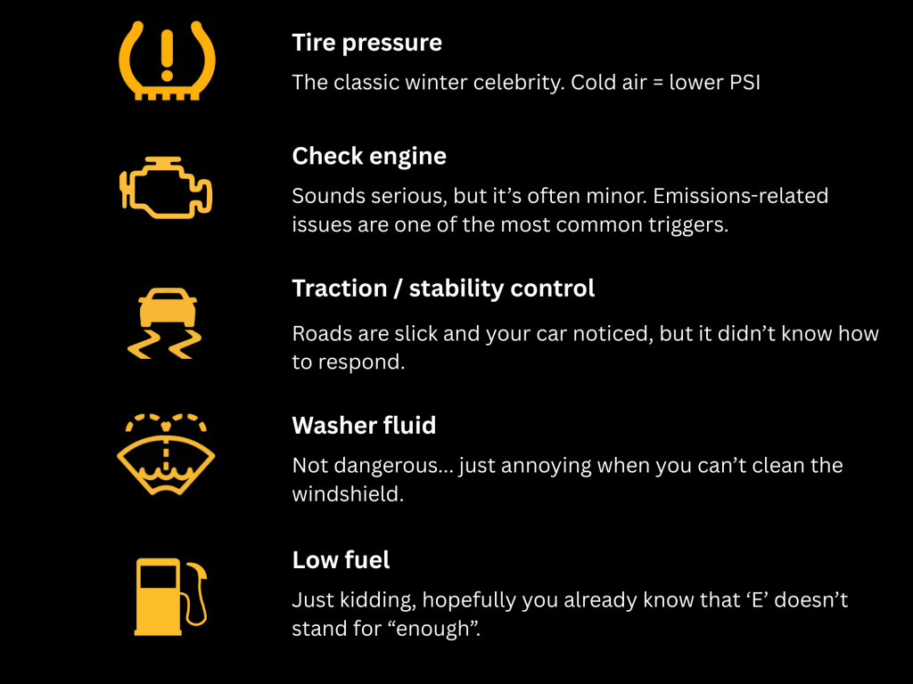Winter loves to make your dash glow like it has holiday plans of its own – tire pressure, check engine light, traction control, all popping on at once.