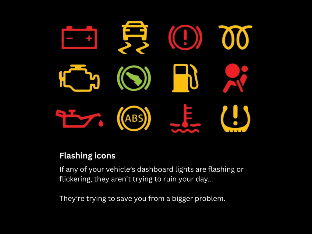 If you see flashing lights, that’s your car saying, “Hey, this is happening right now.” Pull over safely, check your owner’s manual so you know what you’re dealing with, and then decide whether you’re good to keep rolling or if it’s time to call for help.
