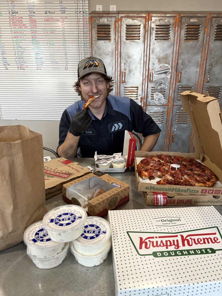 Kevin doing what he does best.. grubbing down on some Blue Sky Bagels, Krispy Kreme donuts, and Mountain Mike’s Pizza. Can you tell what Kevin’s food groups are? Carbs, sugar, and horsepower!