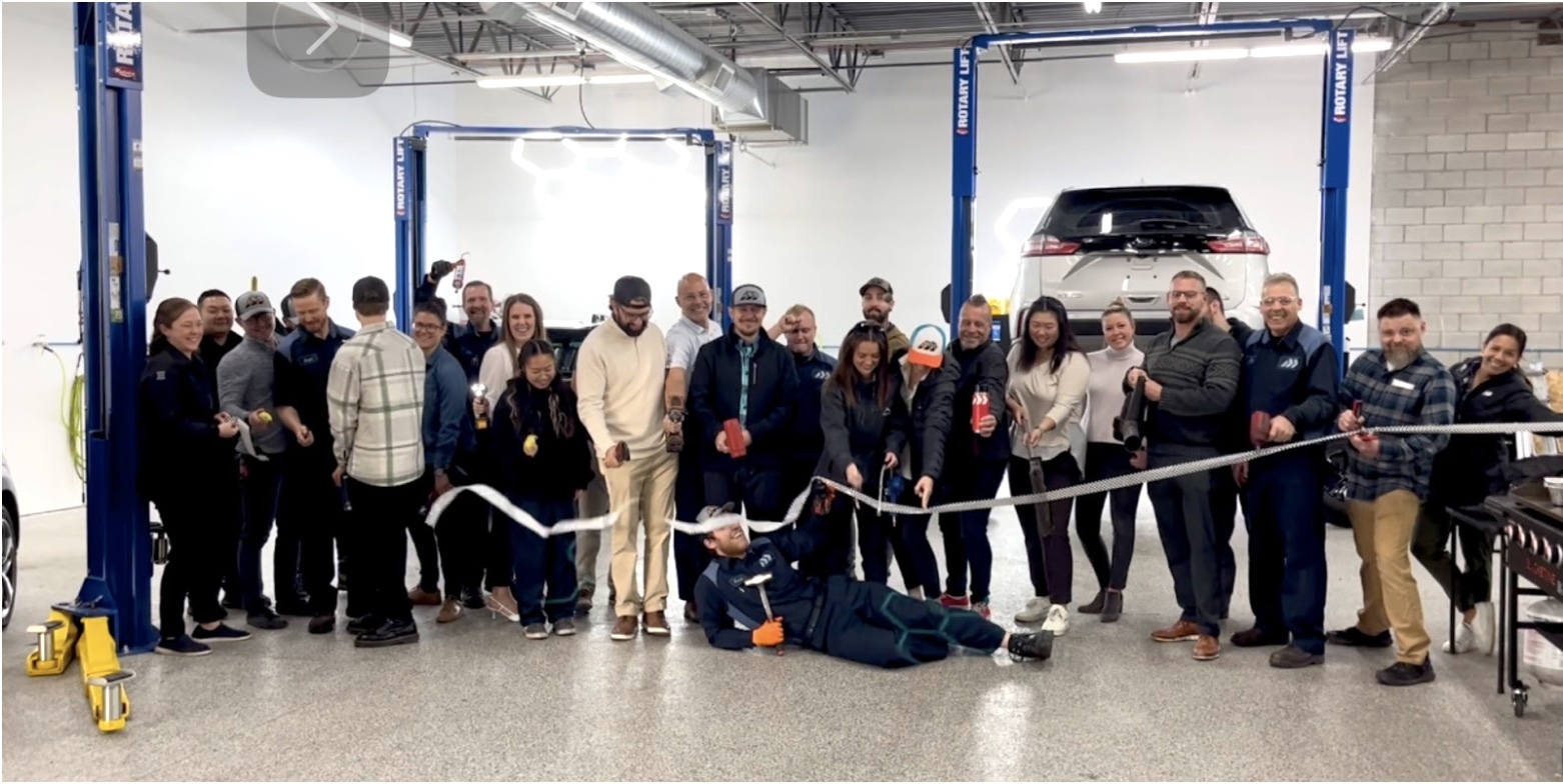 Our parody of a “ribbon cutting” for our new 6-bay shop. Yep, that is duct tape, and they are “cutting” with a blow torch, sledge hammer, pipe wrench, flashlight, and yes, even a banana 😜