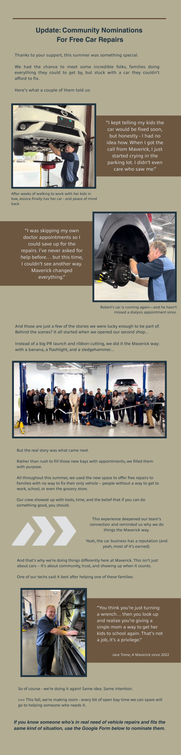 Welcome to the Maverick Journal… our monthly digest from the crew that sells, services, details, consigns, and tells better stories than your neighbor. This issue has it all: bugs that make your car dumb, a rafting trip gone sideways, and a way to get free vehicle repairs for someone you care about. Buckle up.