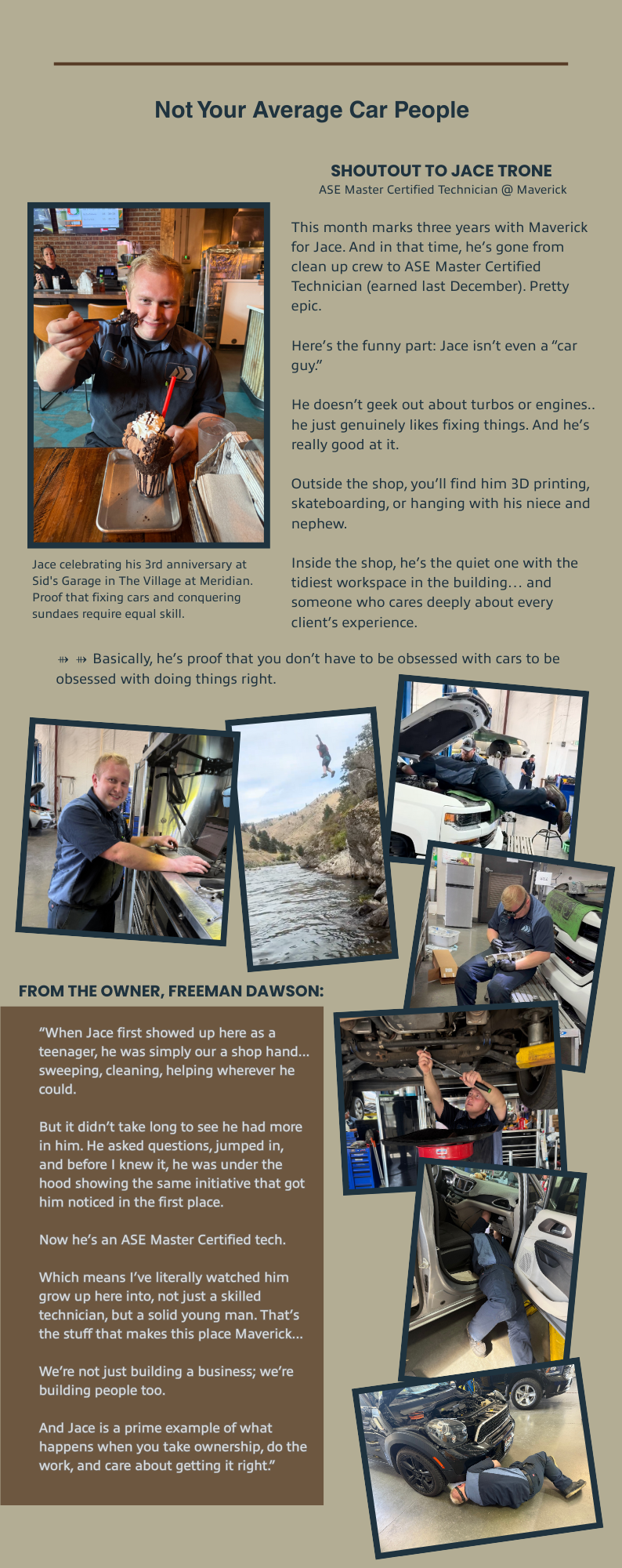Three years ago, Jace was sweeping the lot. Now? He’s an ASE Master Certified tech with the cleanest toolbox in the building. Get to know the quiet guy who proves you don’t have to be obsessed with cars to be obsessed with doing things right.