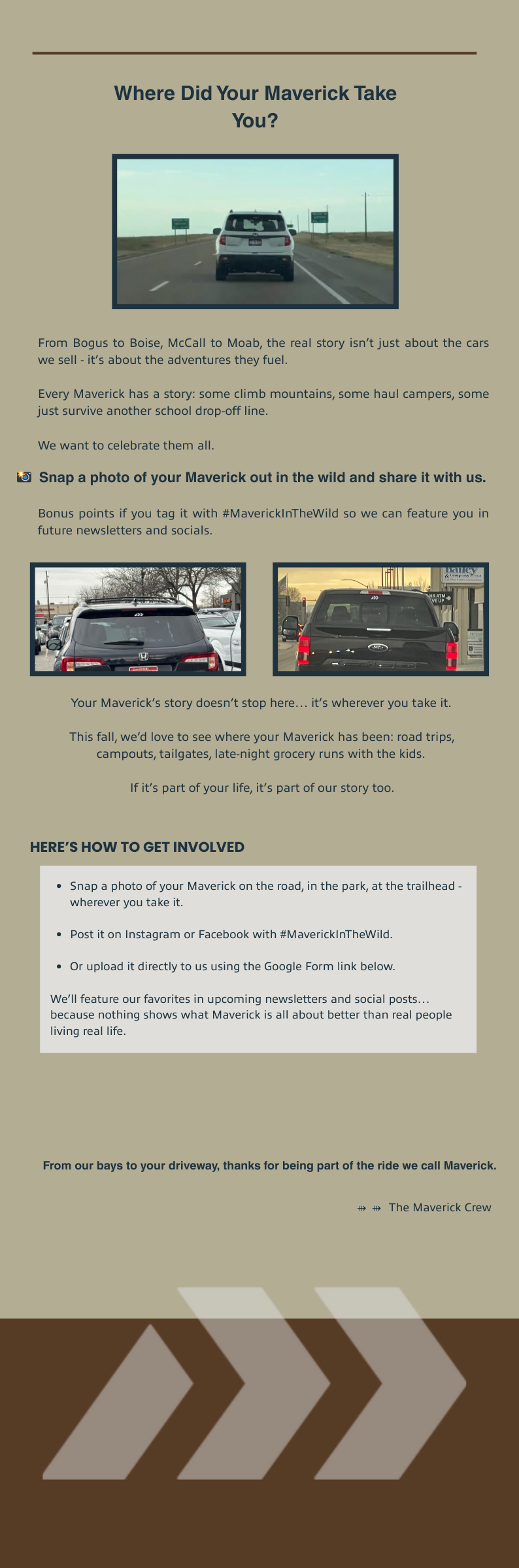 From Bogus to Boise, McCall to Moab – the real story isn’t just about the cars we sell, it’s about the adventures they fuel. Share your photos with #MaverickInTheWild (or upload them here) and you might just see yourself in the next Journal.